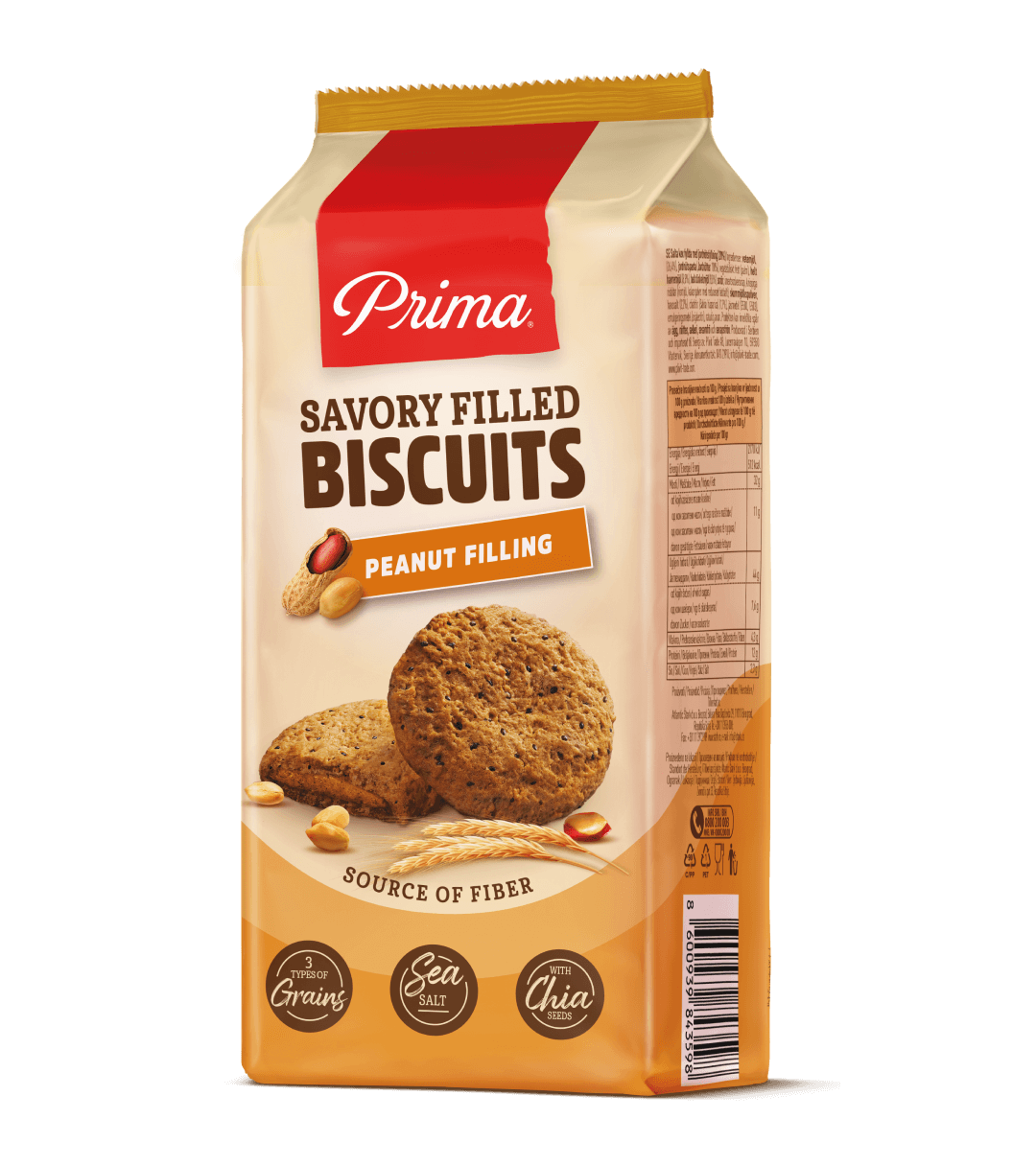 Prima slani punjeni biskviti sa kikiriki punjenjem napravljeni su od tri vrste brašna, ovsenog, speltinog i pšeničnog, i dodatno obogaćeni chia semenkama i hrskavim žitaricama. Bilo da se odlučite za opciju sa kikiriki punjenjem ili punjenjem od semenki bundeve, možete upotpuniti vaš užitak uz jogurt ili omiljeni sok.